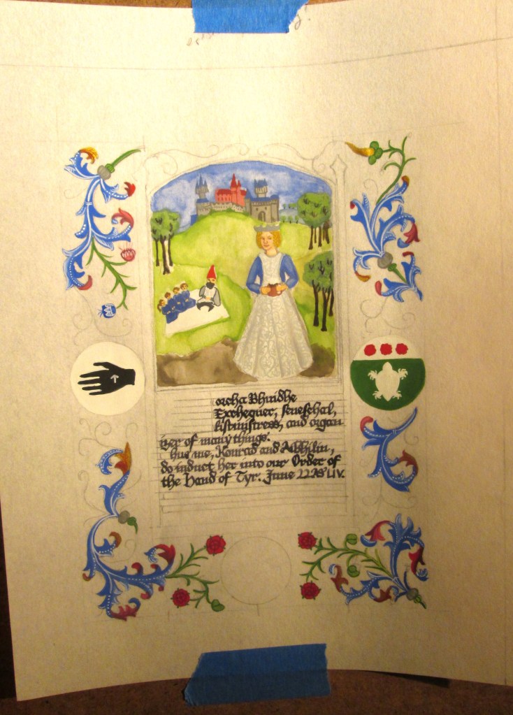 This scroll was done on 8×10″ pergamenata. The first step was laying out all the details I wanted to include in the scroll to personalize it. I do this as a very quick and small thumbnail sketch, so I can easily move things around if I need to.
