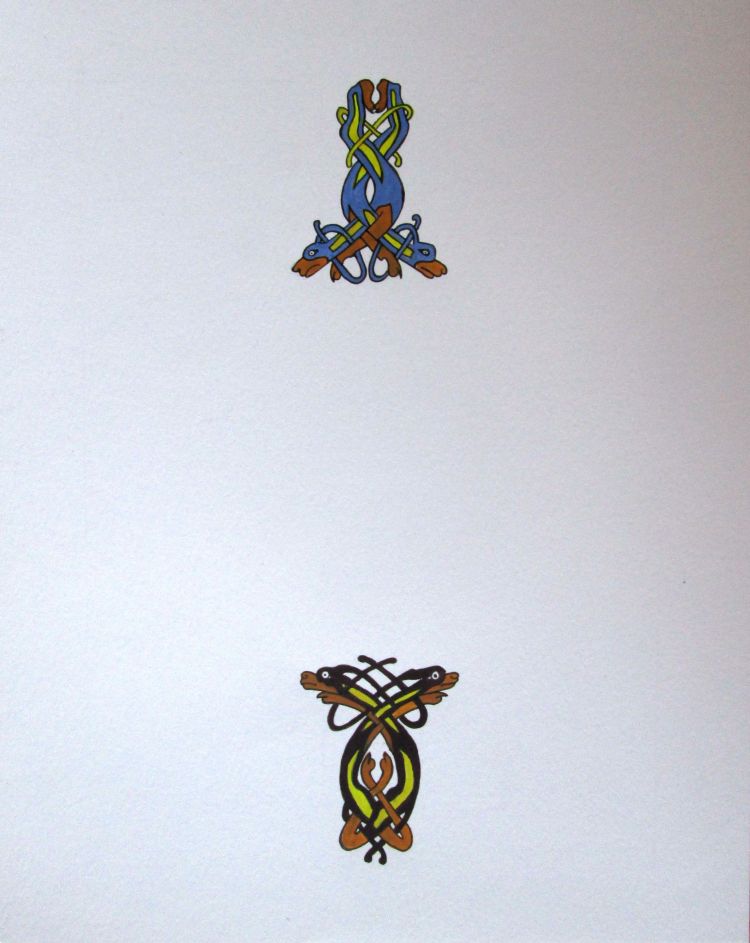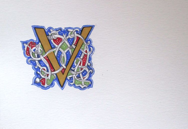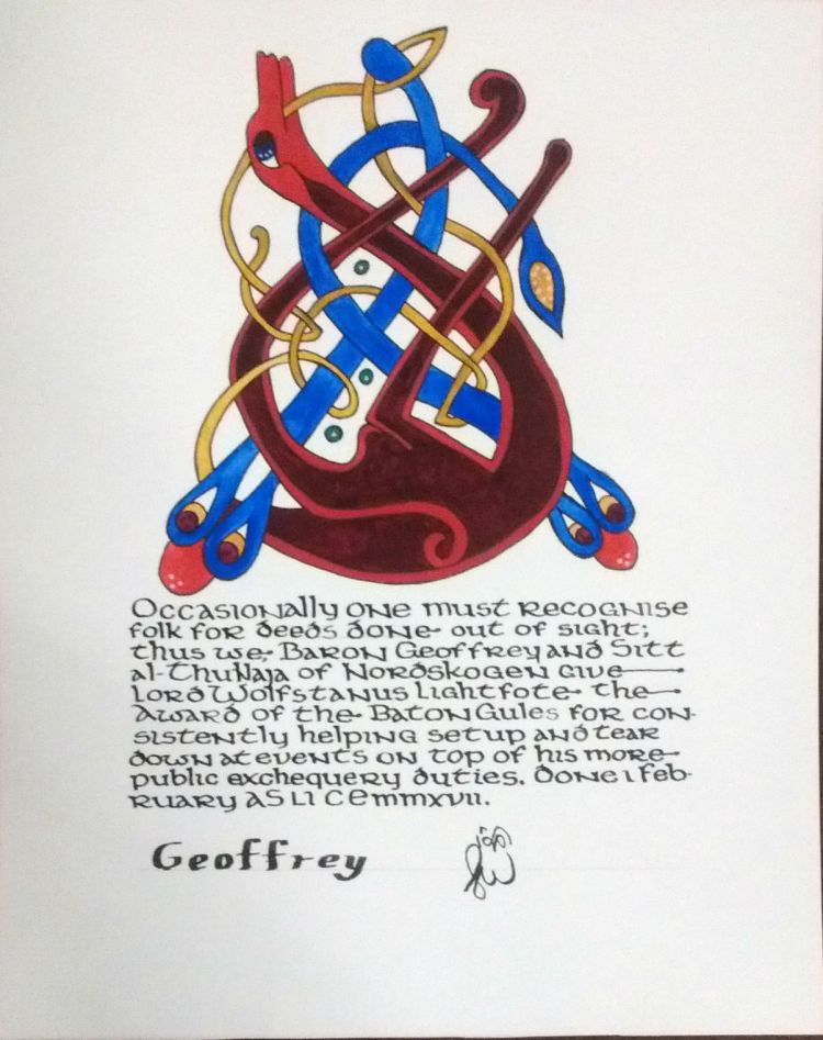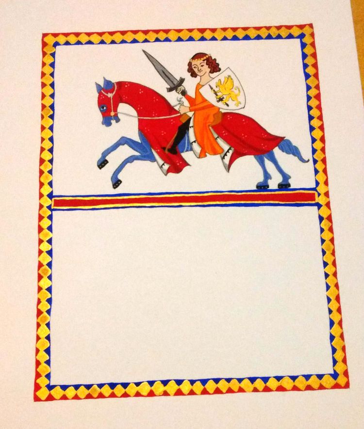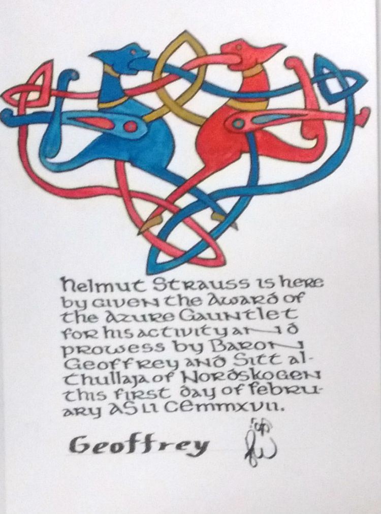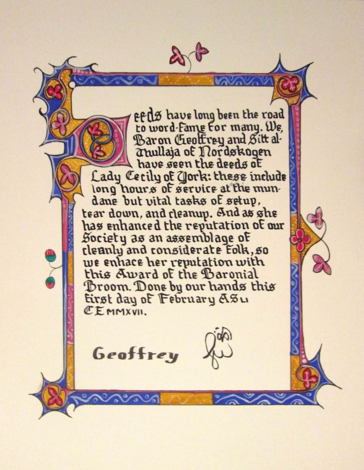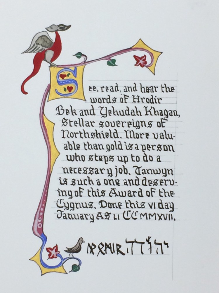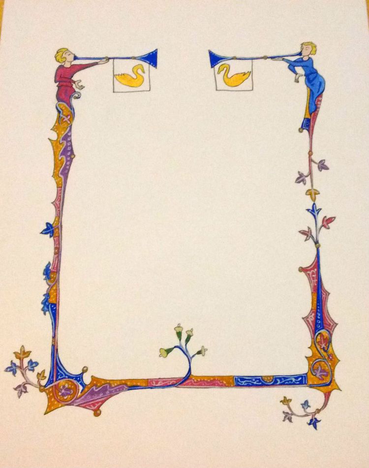 My first foray into the scribal arts was making many scroll blanks in 2016. These were done with gouache and Micron pen on Bristol board. Where there is calligraphy, I have noted who did it.