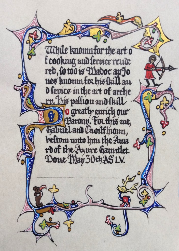 While known for the art of cooking and service rendered, so too is Madoc ap Jones known for his skill and service in the art of archery. His passion and skill do greatly enrich our Barony. For this we, Gabriel and Caoilfhionn, bestow unto him the Award of the Azure Gauntlet. Done May 30th AS LV.