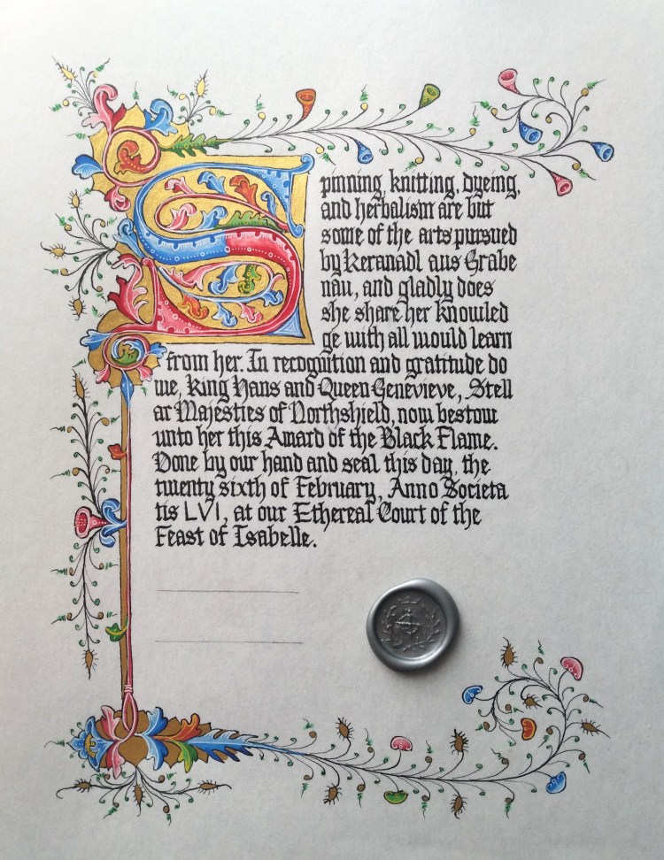 Spinning, knitting, dyeing, and herbalism are but some fo the arts pursued by Keranadl aus Grabenau, and gladly does she share her knowledge with all who would learn from her. In recognition and gratitude do we, King Hans and Queen Genevieve, Stellar Majesties of Northshield, now bestow unto her this Award of the Black Flame. Done by our hand and seal this day, the twenty sixth of February, Anno Societatis LVI, at our Ethereal Court of the Feast of Isabelle.
