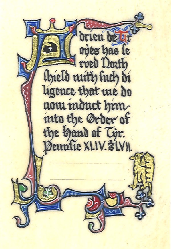 Adrien de Troyes has served Northshield with such diligence that we do now induct him into the Order of the Hand of Tyr. Pennsic XLIV. AS LVII.