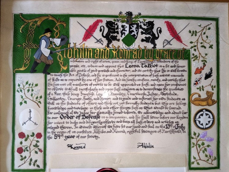 Aibhilin and Konrad, by grace of inspiration and right of arms, queen and king of Northshield, defenders of the people, etc, ordain and appoint that Leona Talbot is a fit and honorable gentle of good prowess and character, and we certify that she is well known to teach the Art of Defense, and she is proficient in the interpretation of such ancient manuals of skills as is required by one of her station.
