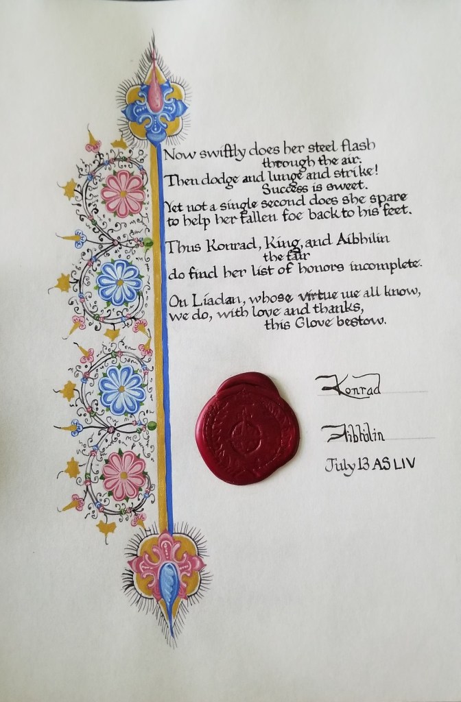 Award: Award of the Glove for Líadan ingen Cheallaigh Date: Warriors and Warlords 2019 Paper: 8×10″ on pergamenata Illumination: Gouache, Finetec gold, iron gall ink Calligraphy: Iron gall ink, .75mm Brause nib Inspiration: MS M.454 fol. 147v, Tuscan Strombotto