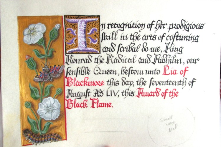 In recognition of her prodigious skill in the arts of costuming and scribal do we, King Konrad the Radical and Aibhilin, our sensible Queen, bestow unto Lia of Blackmore this day, the seventeenth of August AS LIV, this Award of the Black Flame.