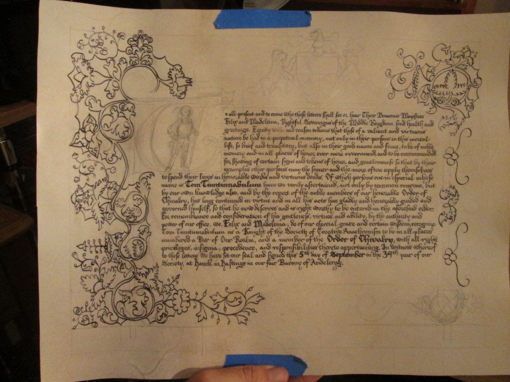 This scroll was done on 8×10″ pergamenata. The first step was laying out all the details I wanted to include in the scroll to personalize it. I do this as a very quick and small thumbnail sketch, so I can easily move things around if I need to.